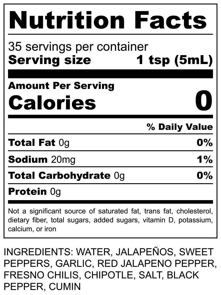 Jalapeños, Water, Sweet Peppers, Garlic, Chili Peppers, Chipotle, Salt, Black Pepper, Cumin.